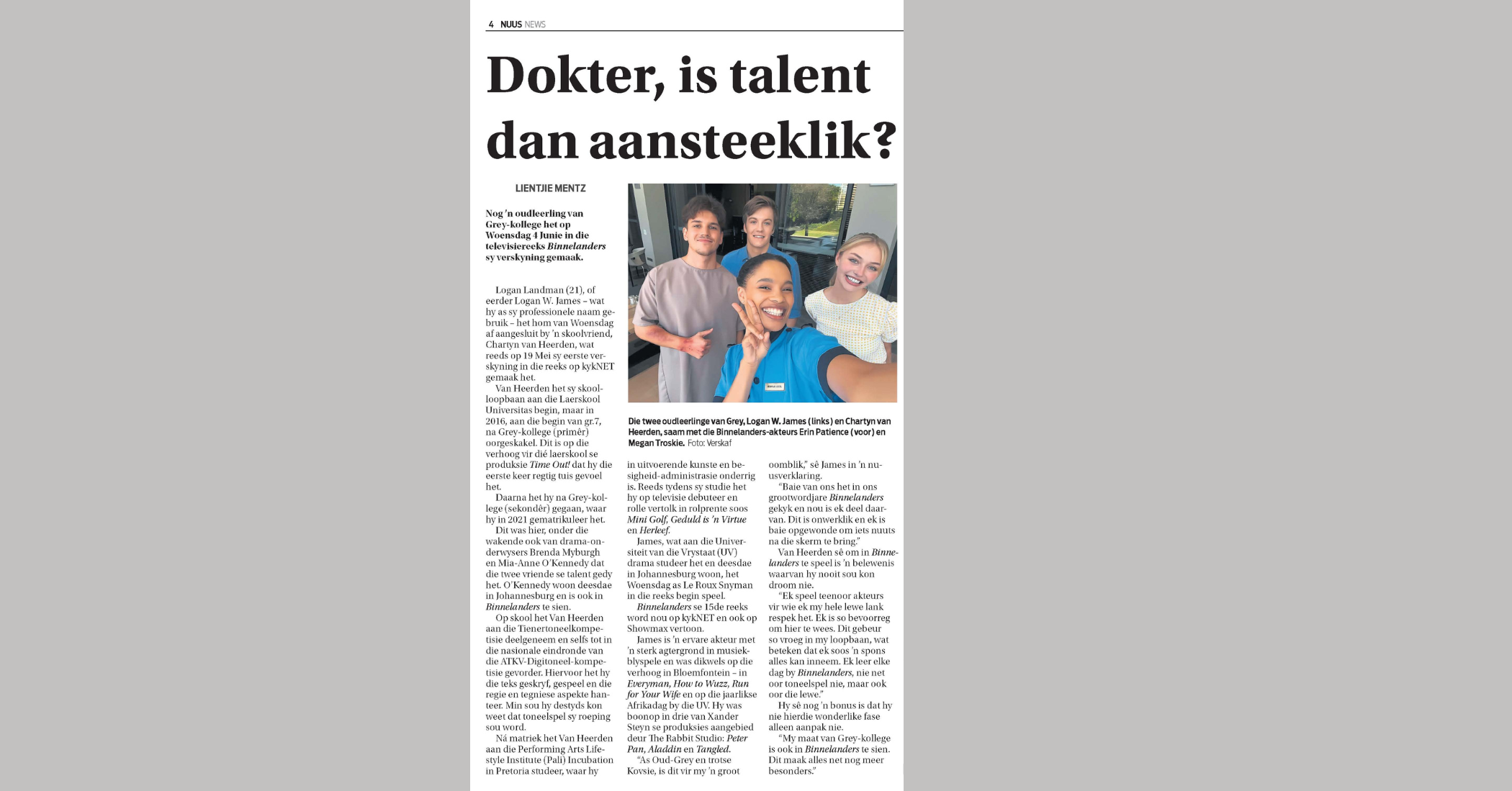 Former Grey College learner Logan W James joins Binnelanders in breakthrough TV role - Bloemfontein Courant -